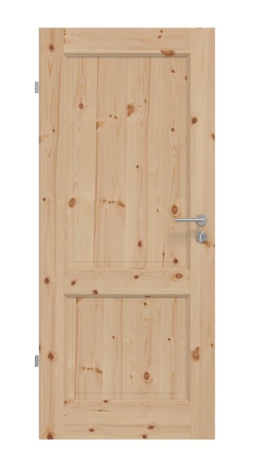 Szerokie, ozdobne fryzy otaczają dwie profilowane wypełnienia. Surowy charakter drewna sosnowego żyje dzięki wyraźnym przejrzystościom sęków i typowym usłojeniom.
