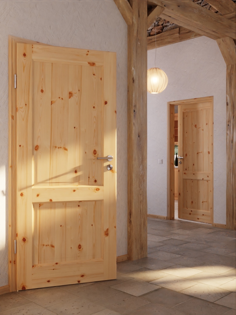 Drzwi z litego drewna klejone warstwowo charakteryzują się szczególnie wysoką stabilnością. W menu konfiguracji masz wybór, czy chcesz model z standardowo nieobrobioną powierzchnią, czy z wysokiej jakości wykończeniem.