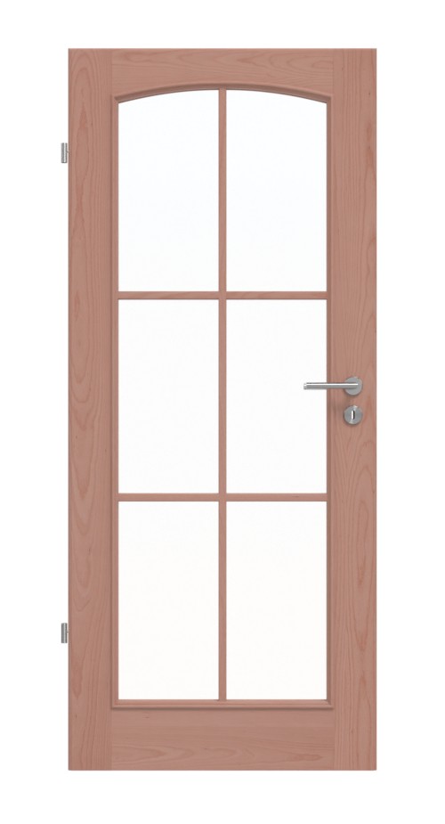 Dzięki dużemu przeszkleniu z eleganckim łukiem segmentowym i ramą z przegrodami do wnętrza wpada przyjemne światło. Ozdobne listwy szklane i szerokie fryzy dopełniają klasyczny design. Naturalna indywidualność drewna bukowego objawia się w każdej parze drzwi w niepowtarzalnym usłojeniu.