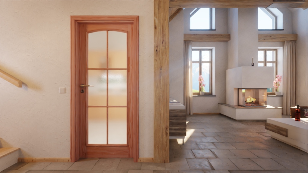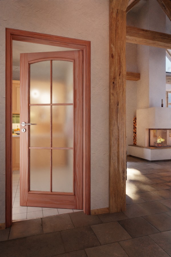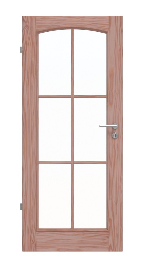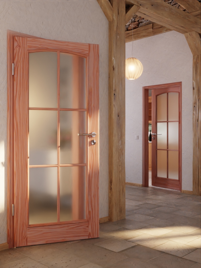 Przestronne szkło z podziałami i łukiem segmentowym wpuszcza dużo światła do Twoich pomieszczeń. Szerokie listwy są harmonijnie uzupełnione przez ozdobne listwy szklane. Naturalne słoje zdobią drewno modrzewiowe, które w swojej ciepłej estetyce tworzy przytulną atmosferę.