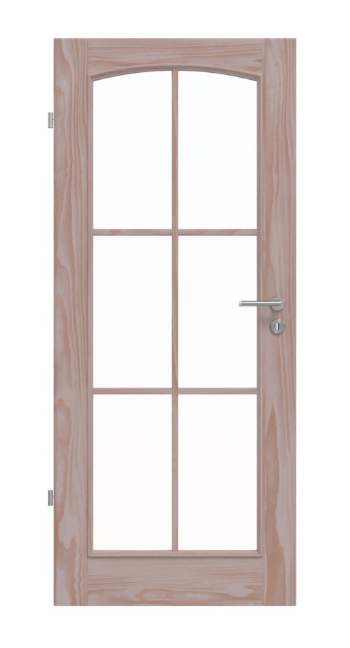 Szerokie listwy i elegancko zdobione ramki szklane otaczają duże przeszklenie, które zdobią delikatne szprosy. U góry otwarcie zamyka stylowy łuk segmentowy, co skutecznie podkreśla klasyczny charakter. Dzięki zawsze indywidualnie przebiegającej słojowości drewna sosnowego każde skrzydło drzwi zyskuje unikalny charakter.