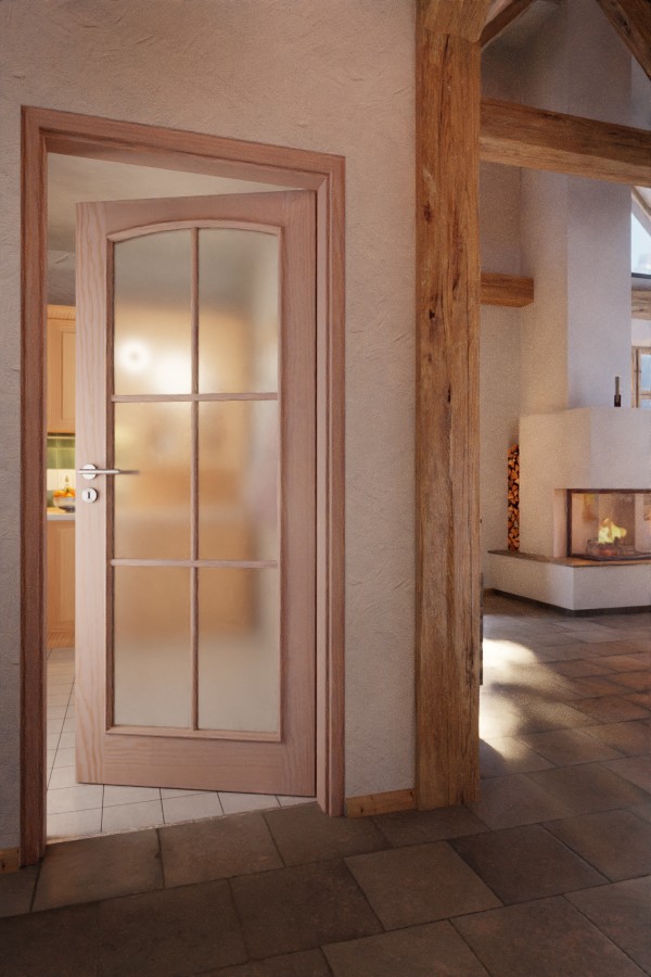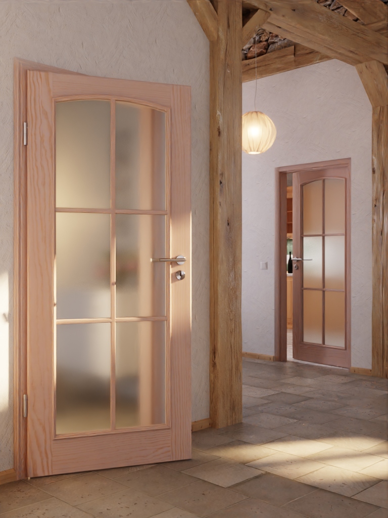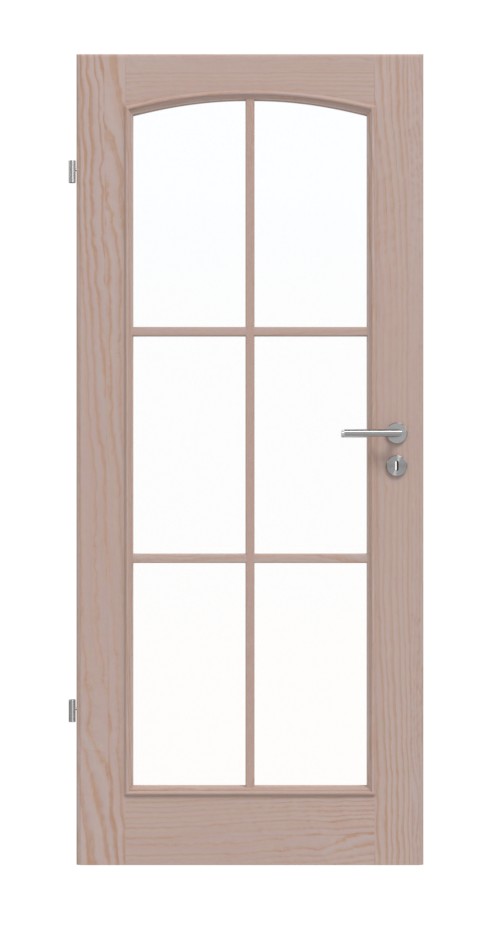 Dzięki dużemu otworowi na światło z stylowym łukiem segmentowym i ramą z przegrodami do wnętrza wpada przyjazne światło. Ozdobne listwy szklane i szerokie fryzy dopełniają klasyczny design. Bezsękowe usłojenie przechodzi przez drewno sosnowe, czyniąc każde skrzydło drzwi unikalnym dziełem.