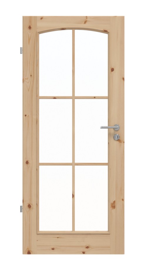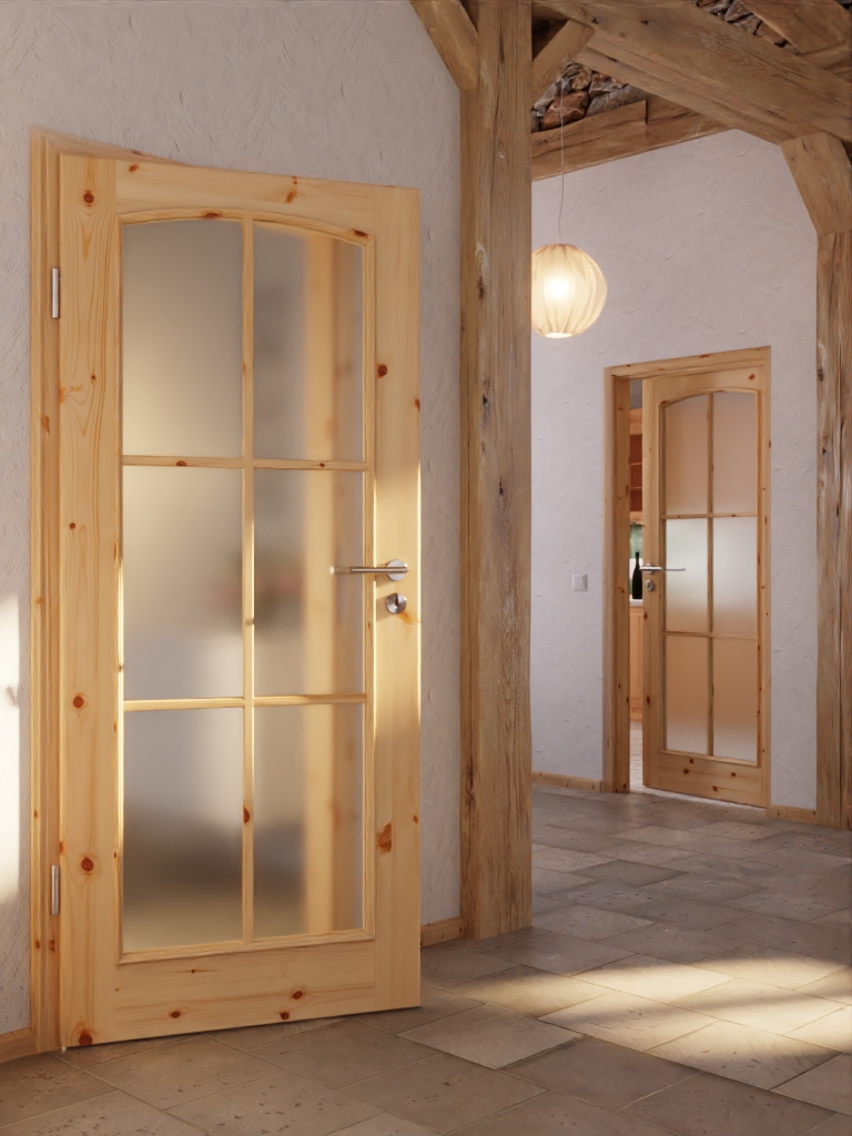 Przestronne szklenie z podziałami i łukiem segmentowym wpuszcza do pomieszczeń mnóstwo światła. Szerokie listwy są harmonijnie uzupełnione przez ozdobne ramki szklane. Każde skrzydło drzwi jest przesiąknięte indywidualnymi słojami z wyraźnymi ramkami sękowymi, które nadają sosnowemu drewnu rustykalny charakter.