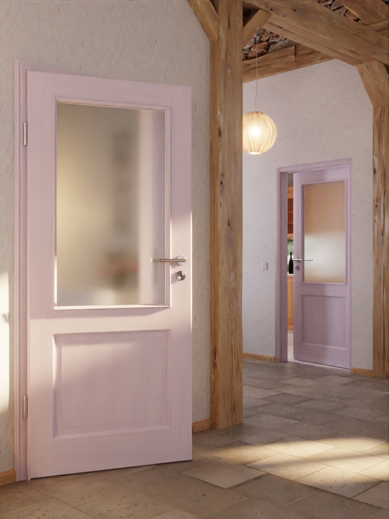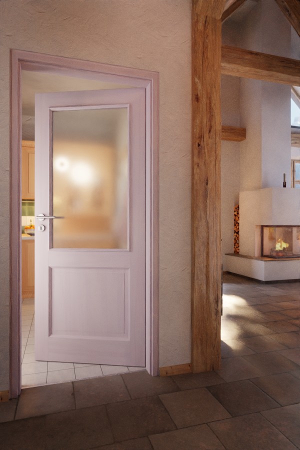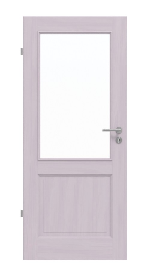 Klasyczny wygląd drzwi uzyskuje się dzięki wyodrębnionemu wypełnieniu w dolnej części, które jest harmonijnie otoczone eleganckimi profilami fryzowymi. Ponadto wstawka szklana pozwala na przyjemny dopływ światła. Powierzchnia pokryta jest białym pigmentem, który delikatnie przepuszcza bezsękowy rysunek sosny.