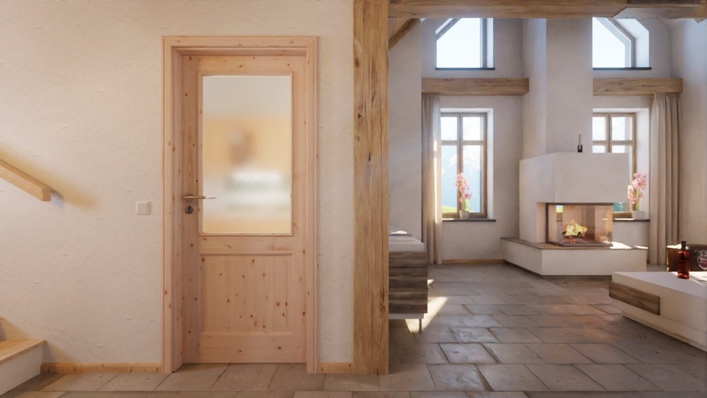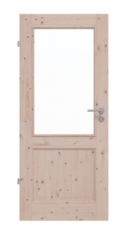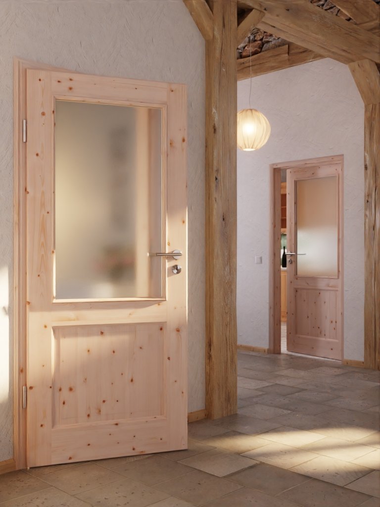 Duże okno świetlne w górnej części skrzydła drzwi pozwala na przyjemny napływ światła. Poniżej profilowane fryzy otaczają klasyczne wypełnienie z prawdziwego drewna, które w połączeniu z eleganckimi listwami szklanymi tworzy stylowy wygląd. Typowe usłojenie i wyraźne wtrącenia sęków nadają rustykalny charakter drewna świerkowego.