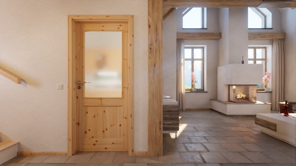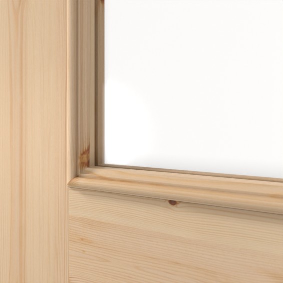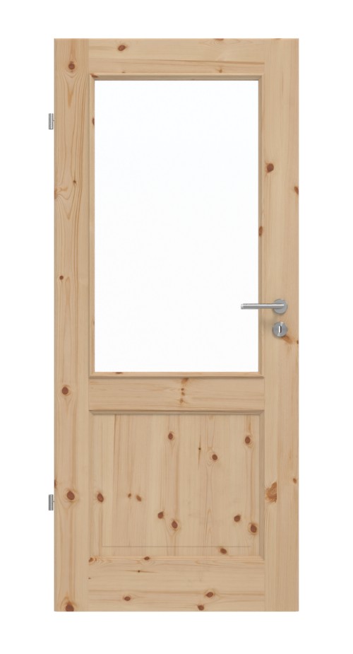 Duża przestrzeń świetlna w górnej części skrzydła drzwi pozwala na przyjemny napływ światła. Poniżej profilowane fryzy otaczają klasyczne wypełnienie z prawdziwego drewna, które w połączeniu z eleganckimi listwami szklanymi tworzy stylowy wygląd. Typowe usłojenie delikatnie rysuje się na drewno sosnowym i nadaje rustykalny akcent dzięki żywym ramkom sękatym