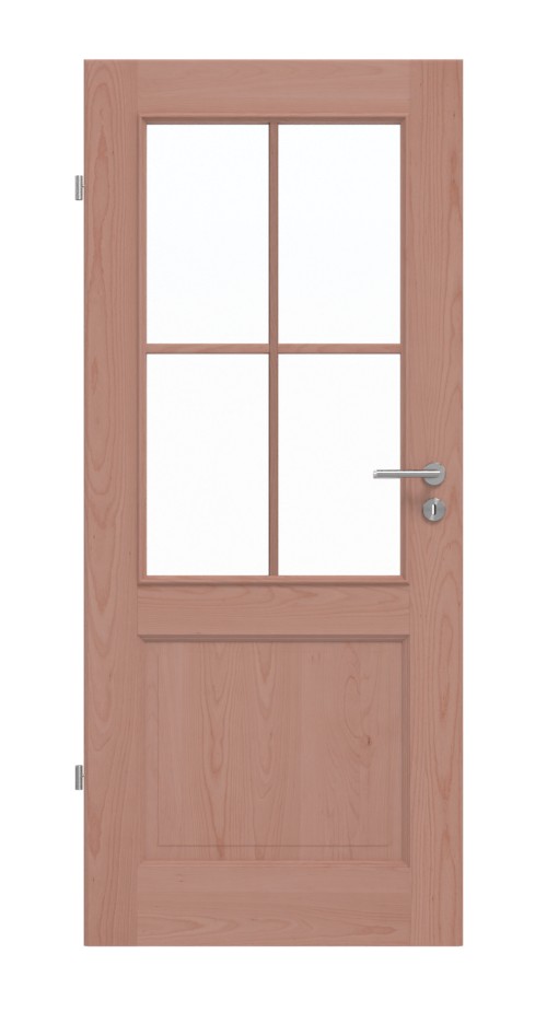 Stylowe szprosy i listwy szklane zdobią przeszklenie w górnej części skrzydła drzwi. Poniżej znajduje się wyraźnie zaznaczona wypełnienie z prawdziwego drewna, które jest harmonijnie akcentowane przez ozdobne profile fryzowe. Delikatnie czerwonawe drewno bukowe jest przetykane subtelnym usłojeniem.