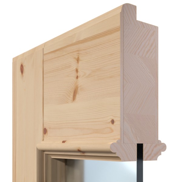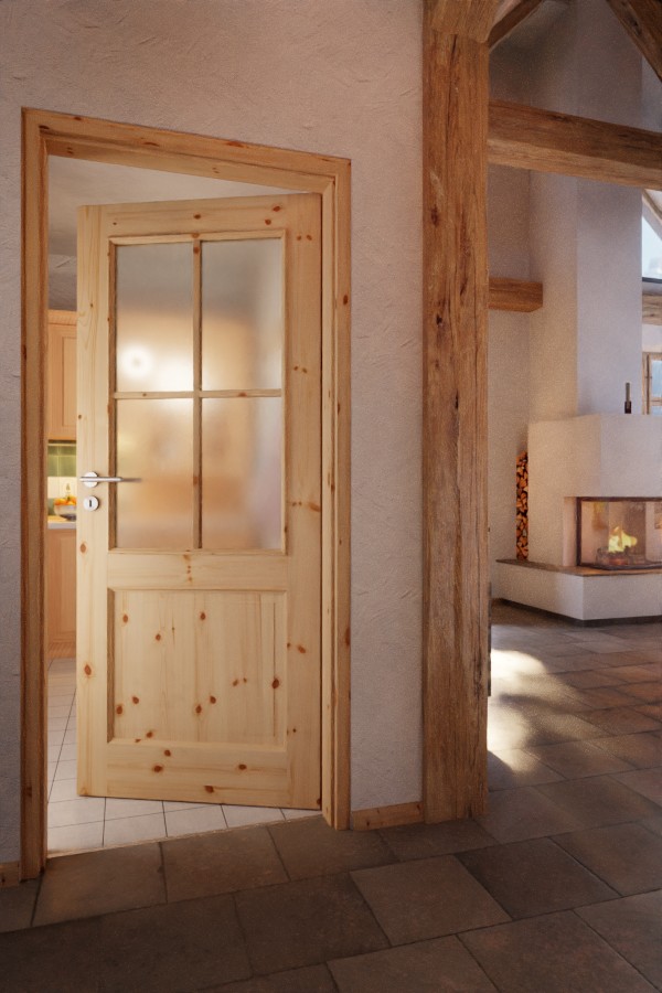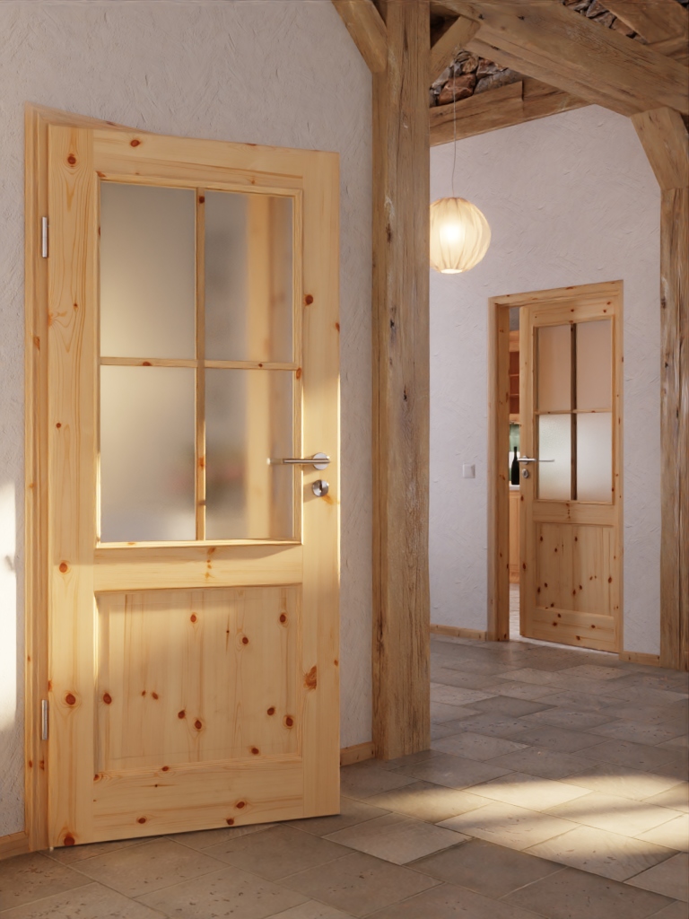 Stylowe szprosy i listwy szklane zdobią świetlik w górnej części skrzydła drzwi. Poniżej znajduje się wykończenie z prawdziwego drewna, które jest harmonijnie akcentowane przez ozdobne profile fryzowe. W drewnie sosnowym wyraźnie rysują się charakterystyczne ramy sęków, nadając mu rustykalny charakter.