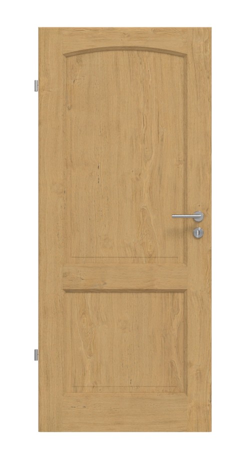 Elegancko prezentuje się skrzydło drzwiowe z dwoma eleganckimi wypełnieniami z prawdziwego drewna, łukiem segmentowym i stylowymi profilowaniami. Ciepły odcień drewna dębu jest przetykany charakterystycznym słojem.