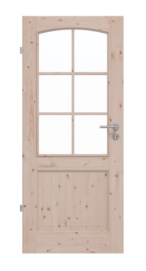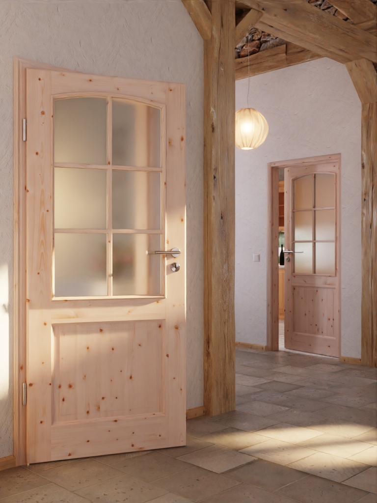 Eleganckie szprosy i listwy szklane nadają świetlikowi z łukiem segmentowym klasyczny charakter. W dolnej części skrzydła drzwi znajduje się również wyodrębniona wypełnienie z prawdziwego drewna, które jest podkreślone stylowymi profilami fryzowymi. Dynamika sęków ozdabia świerk i sprawia, że każde skrzydło drzwi jest unikalnym dziełem.