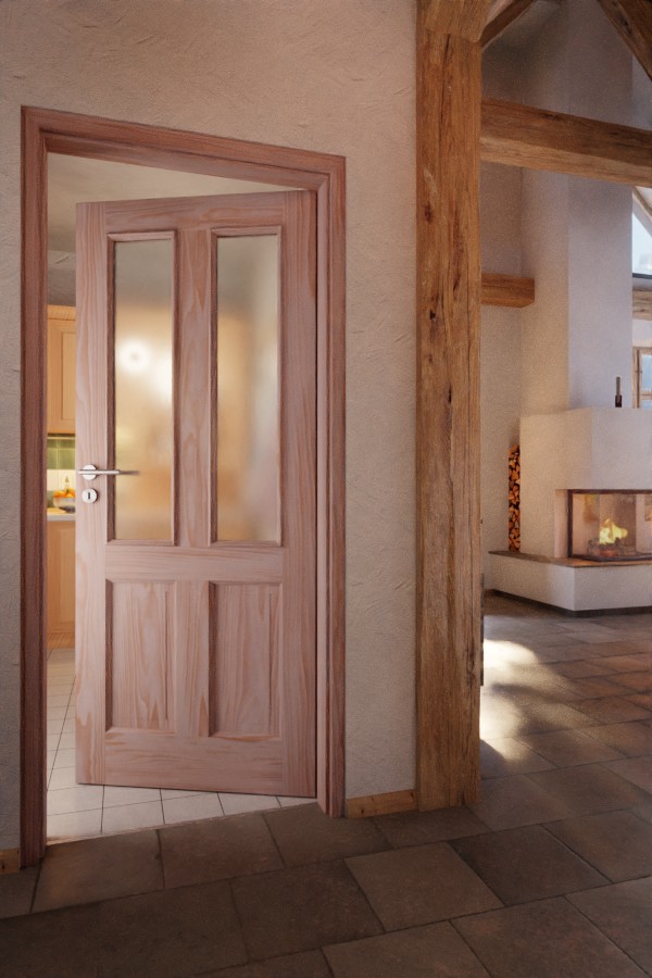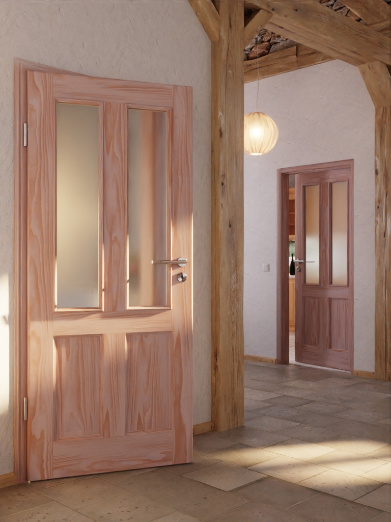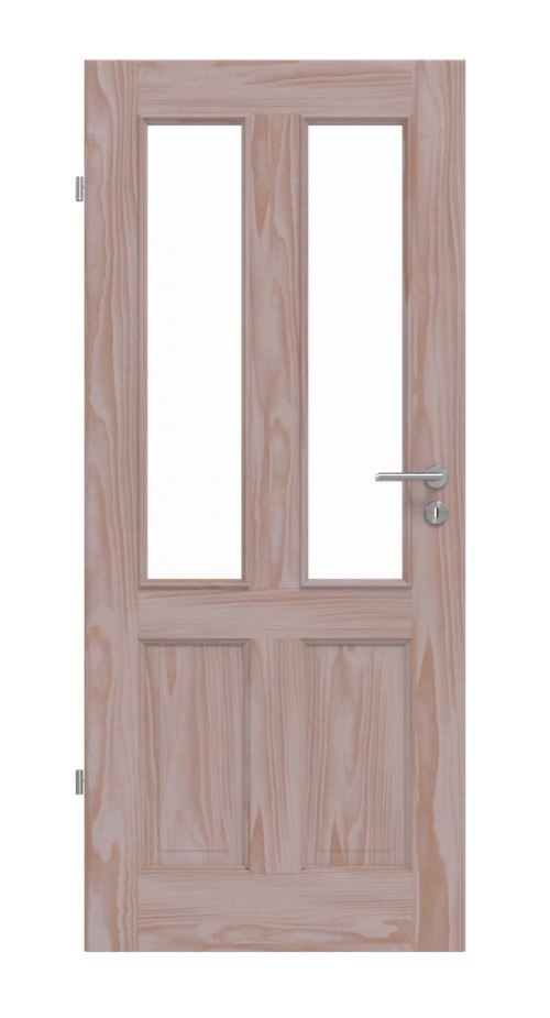 W skrzydle drzwi znajdują się u góry dwa smukłe przeszklenia, a na dole dwa profilowane wypełnienia z prawdziwego drewna. Ozdobne fryzy i eleganckie listwy szklane tworzą harmonijne wykończenie. Naturalna, bezsękowa struktura przechodzi przez drewno sosnowe i ukazuje na każdym skrzydle drzwi unikalny wzór.