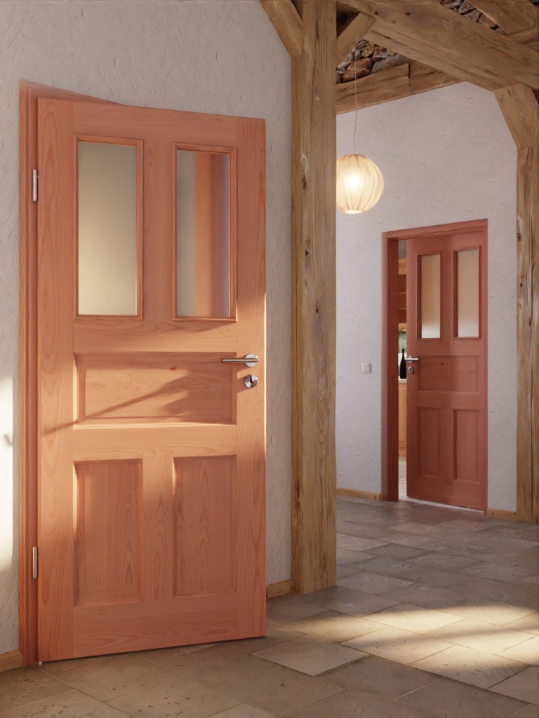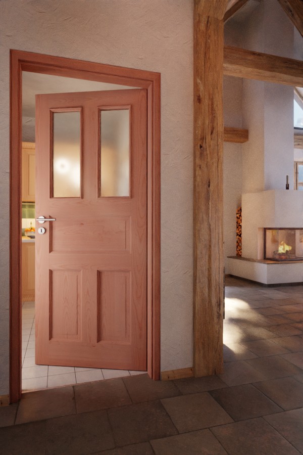 Dwa okna świetlne z otaczającymi je listwami szklanymi, trzy wyraźne wypełnienia z prawdziwego drewna oraz eleganckie profilowania podkreślają klasyczny wygląd skrzydła drzwi. Żadne drzwi nie są takie same, ponieważ delikatne słoje buku na każdym skrzydle drzwi są całkowicie unikalne.