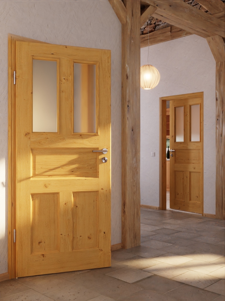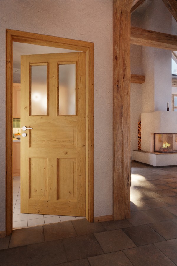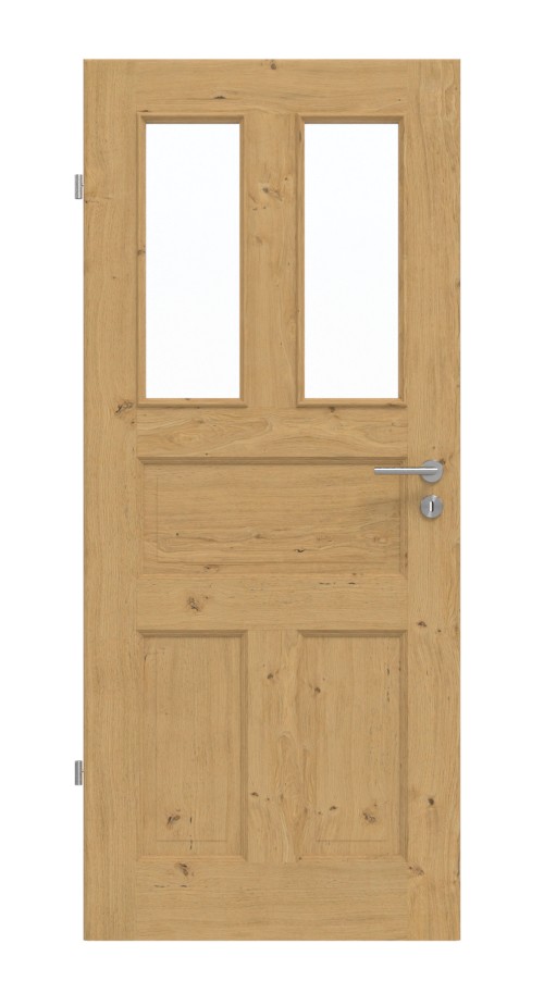 Dwa przeszklenia z okalającymi listwami szklanymi zdobią górną część skrzydła drzwi. Poniżej trzy profilowane wypełnienia z prawdziwego drewna uzupełniają elegancki design. Drewno dębowe charakteryzuje się żywą strukturą z sękami, która w unikalny sposób odznacza się na każdym skrzydle drzwi.