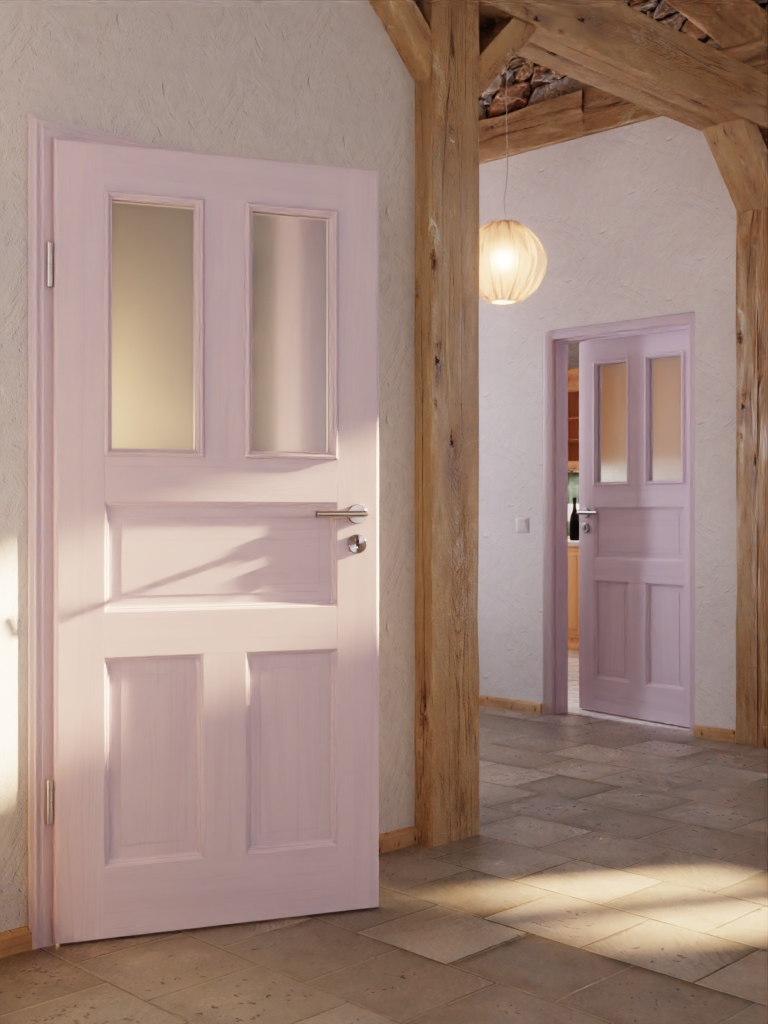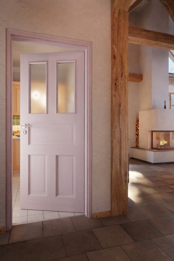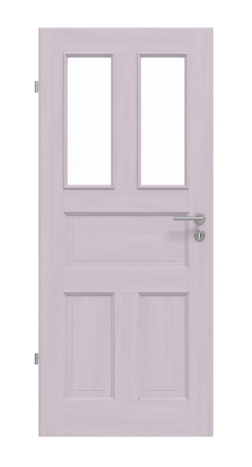 Harmonijnie uzupełniają się dwa okna świetlne i trzy profilowane wypełnienia w klasycznie pięknym designie. Dzięki białemu pigmentowi delikatnie uwidaczniają się bezsękowe usłojenia świerku.