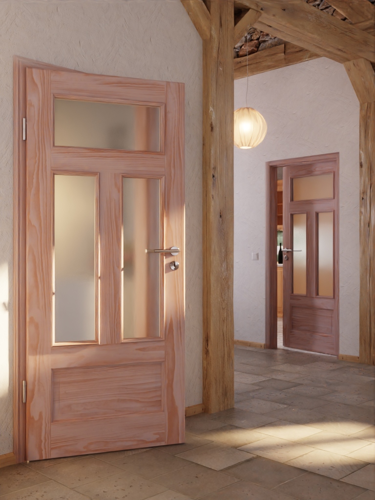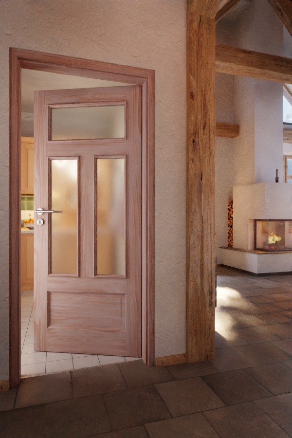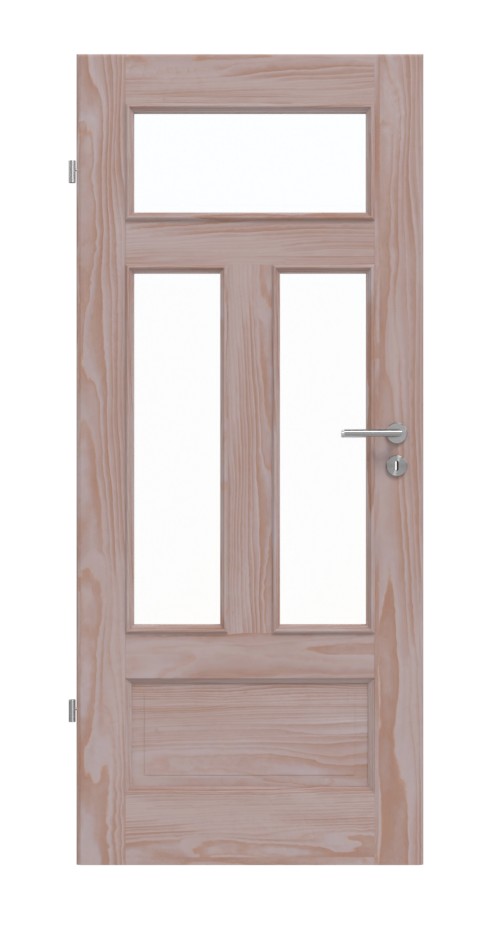 Dzięki trzem przeszkleniom do wnętrza wpada przyjemne światło. Otoczone są eleganckimi listwami szklanymi w klasycznym stylu. W dolnej części harmonijnie dopełnia design profilowana wypełnienie. Piękny i zawsze indywidualny usłojenie zdobi sosnowe drewno bezsękowe.