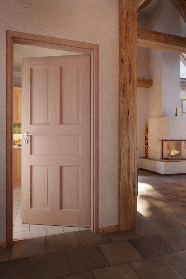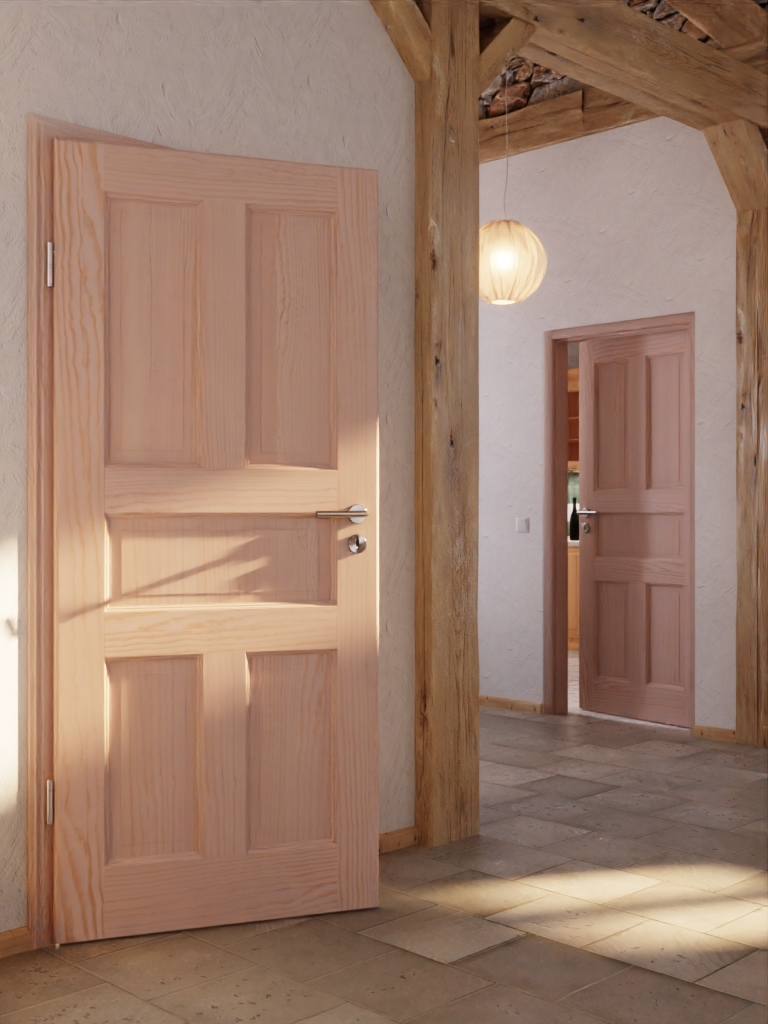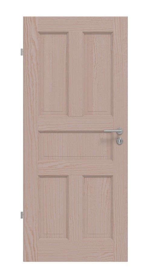 Pięć wysuniętych wypełnień z prawdziwego drewna w połączeniu z eleganckimi profilami fryzowymi tworzy ponadczasowy, piękny wygląd. Naturalne, pozbawione sęków usłojenie drewna sosnowego nadaje każdemu skrzydłu drzwi niepowtarzalny wygląd.