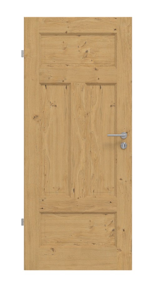 Ich cztery profilowane wypełnienia obiecują ponadczasowy wygląd. Harmonijnie zdobione profile fryzowe podkreślają klasyczną urodę. Sękowana struktura drewna dębowego jest wyjątkowo widoczna na każdym skrzydle drzwi.