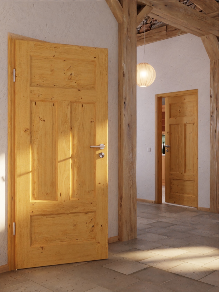 Drzwi z litego drewna są wykonane w technologii klejenia warstwowego. Niezależnie od tego, czy są nieobrobione, lakierowane czy olejowane – do perfekcyjnego wykończenia dostępne są różne rodzaje wykończenia powierzchni.