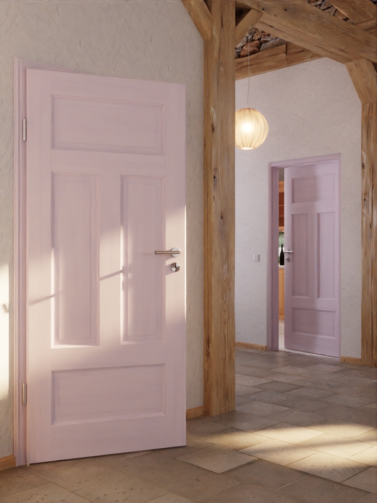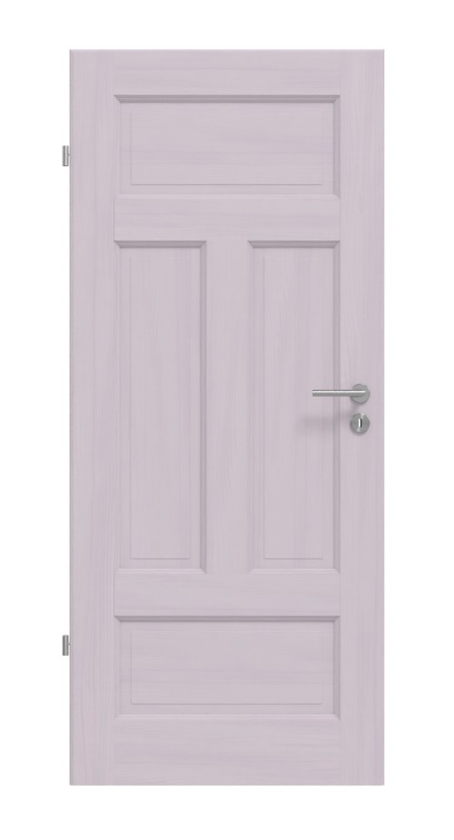 Cztery wypełnienia charakteryzują się szerokimi profilowaniami, które harmonijnie zaokrąglają eleganckie profile fryzowe. Delikatnie rysują się bezsękowe usłojenia świerku pod białym pigmentem, nadając każdemu skrzydłu drzwi unikalny, indywidualny charakter.