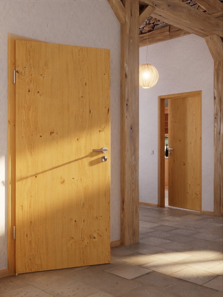 Dzięki klejonemu konstrukcji drzwi z litego drewna wykazują szczególną stabilność. W celu uzyskania odpowiedniego wykończenia możesz zdecydować się w menu konfiguracyjnym. Alternatywnie, standardowo nieobrobiona powierzchnia oferuje elastyczne możliwości samodzielnego wykończenia drzwi.