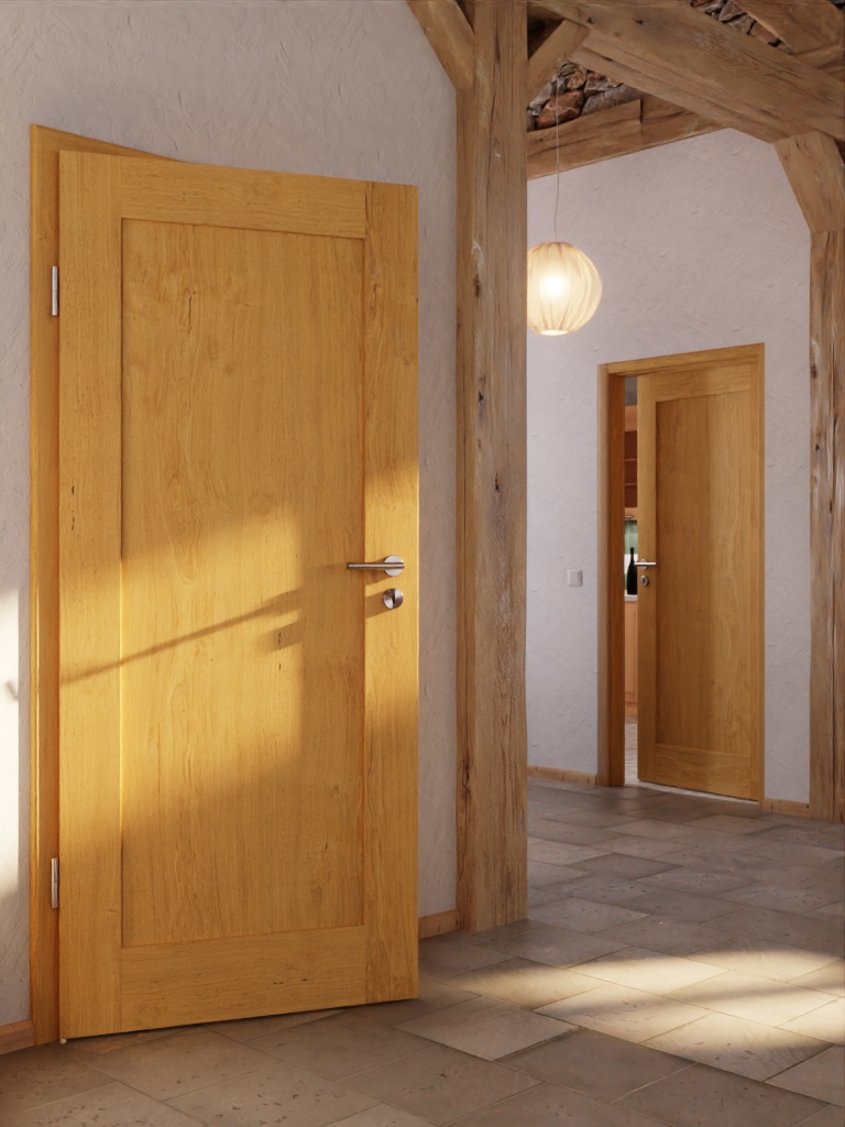 Za szczególnie wysoką stabilność drzwi z litego drewna odpowiada produkcja w technologii klejenia warstwowego. Standardowo nieobrobiona powierzchnia może być pomalowana w Twoim ulubionym kolorze. Możesz również wybrać w menu konfiguracji jedną z wysokiej jakości wykończeń i otrzymać drzwi już z gotowym wykończeniem – wybór należy do Ciebie.