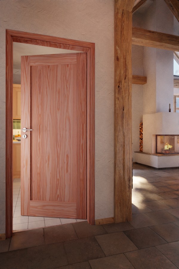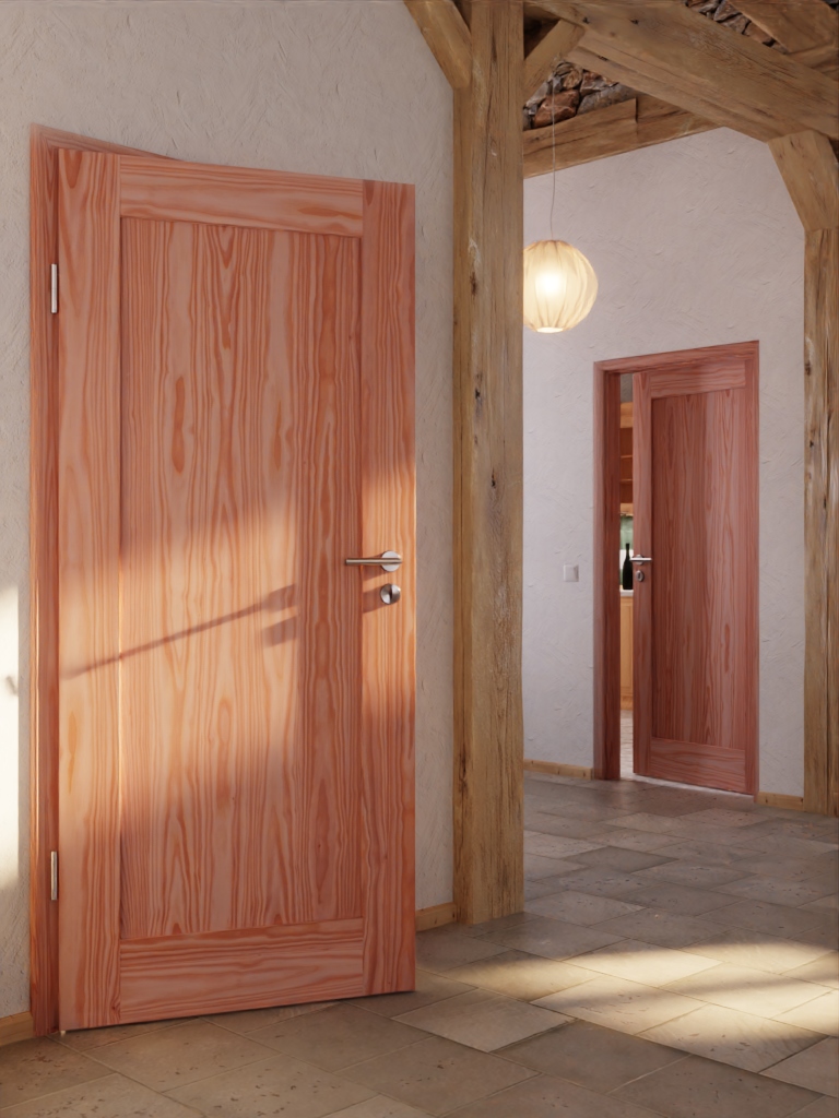 Dzięki szerokim fryzom i dużej wypełnieniu w środkowej części skrzydła drzwi, drzwi wewnętrzne mówią jasnym językiem form. Charakterystyczne słoje rozciągają się na ciepłym drewno modrzewiowym i wprowadzają przytulny nastrój do pomieszczenia.