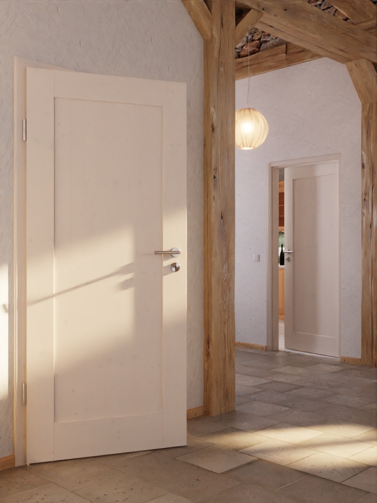 Unikat o ponadczasowym pięknie: W drzwiach z litego drewna TM-1 świerk astig bielony pigmentem łączą się harmonijny design i solidna jakość prawdziwego drewna.