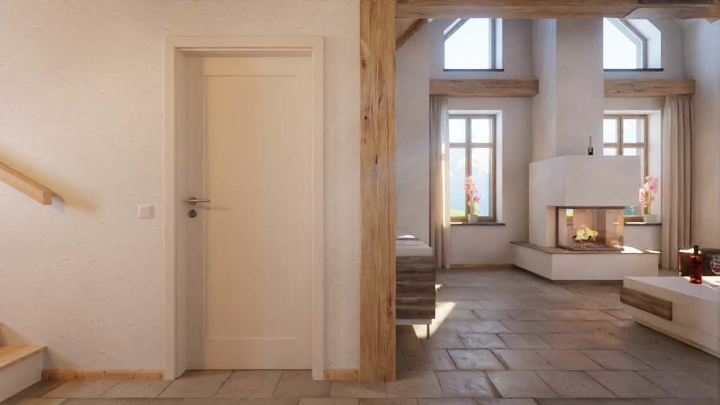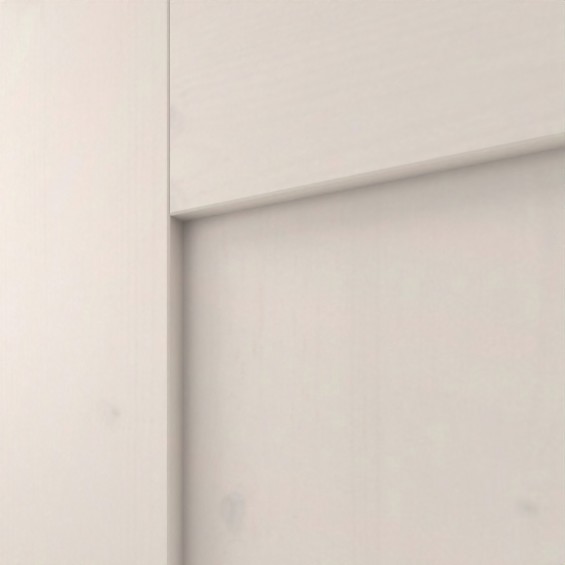 W środkowej części skrzydła drzwi znajduje się duża wypełniona część, która tworzy prostą i nowoczesną estetykę. Z każdej strony otoczona jest przez szerokie fryzy. Z wdziękiem rysuje się słojowanie świerka pod białym pigmentem, nadając każdemu skrzydłu drzwi indywidualny charakter.
