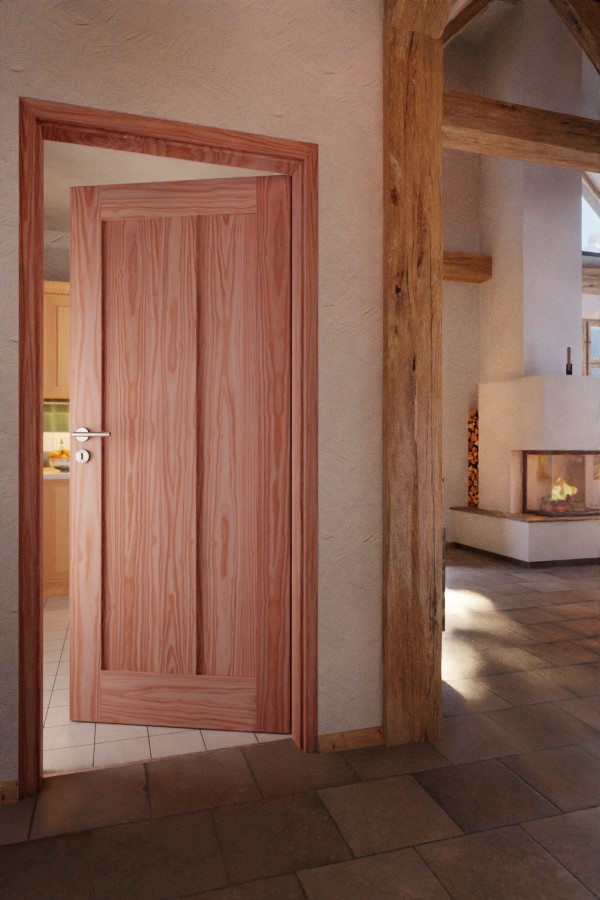 Nowoczesna estetyka modelu opiera się na wyraźnych liniach fryzów oraz dwóch płaskich wypełnieniach z prawdziwego drewna. Naturalne usłojenie zdobi drewno modrzewiowe, które w swojej ciepłej optyce tworzy przytulną atmosferę.