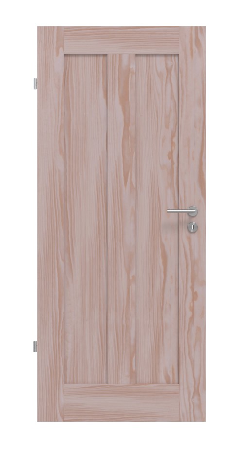 Proste listwy i dwa wąskie, stojące wypełnienia z prawdziwego drewna łączą się tutaj w nowoczesny wygląd. Bezsękowe usłojenie rozciąga się na drewno sosnowe i nadaje każdym drzwiom indywidualny charakter.