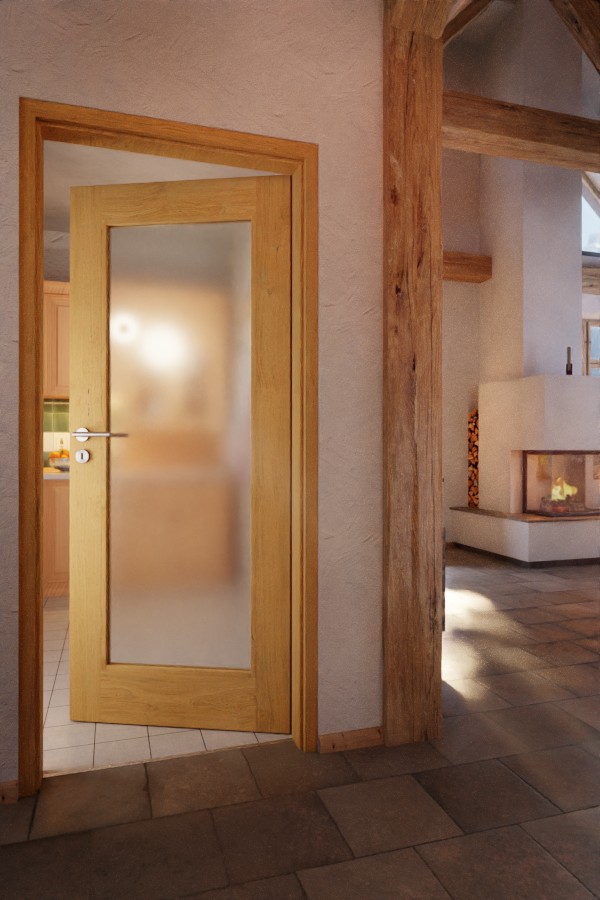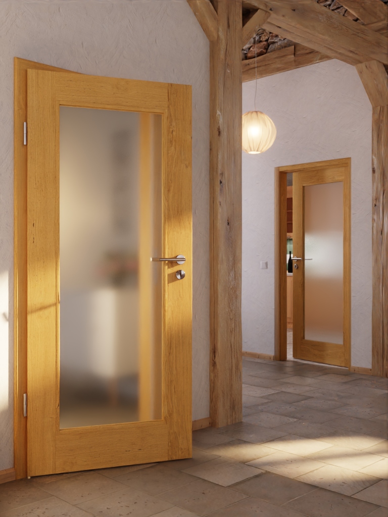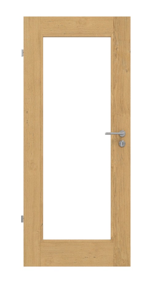 Wyraźne linie kształtują nowoczesny wygląd modelu. Duże przeszklenie w środku skrzydła drzwi otoczone jest prostymi listwami i szerokimi fryzami. Zawsze indywidualnie, naturalne usłojenie dębu jest widoczne na każdym skrzydle drzwi.