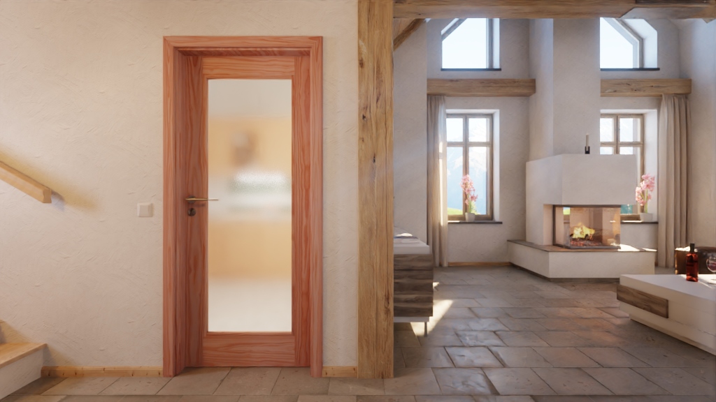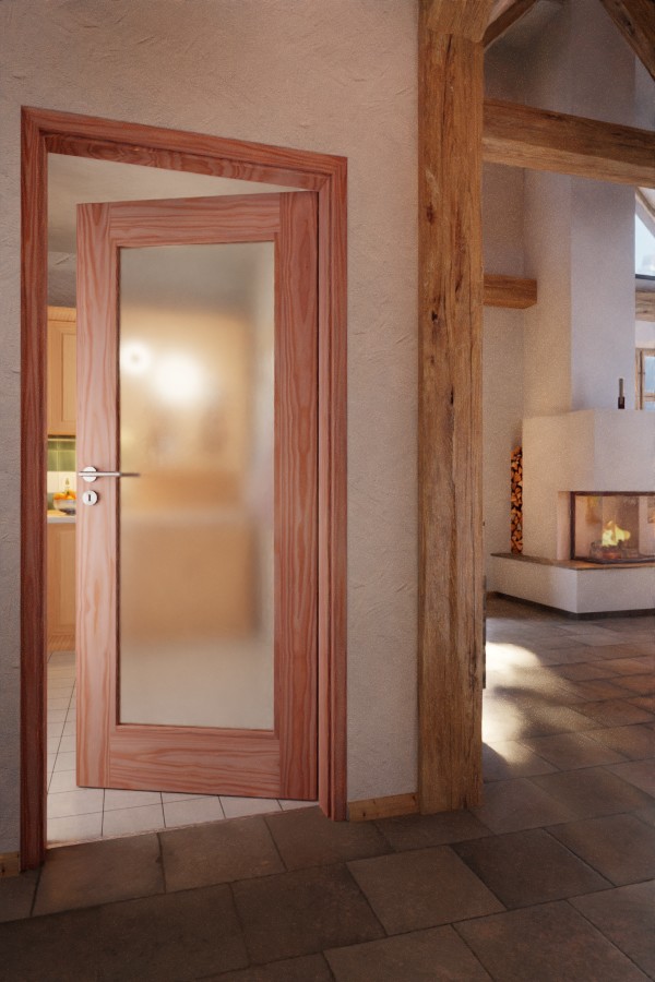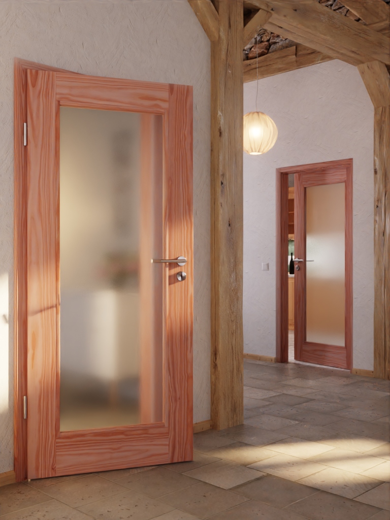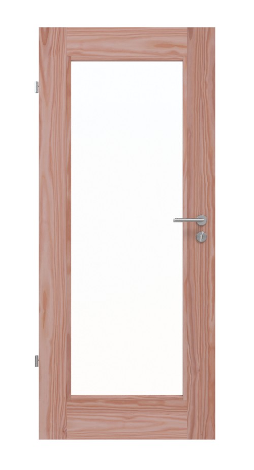 Proste linie kształtują nowoczesny wygląd modelu. Duże przeszklenie w środku skrzydła drzwi otoczone jest prostymi listwami i szerokimi fryzami. Naturalne słoje zdobią drewno modrzewiowe, które w swojej ciepłej estetyce tworzy przytulną atmosferę.