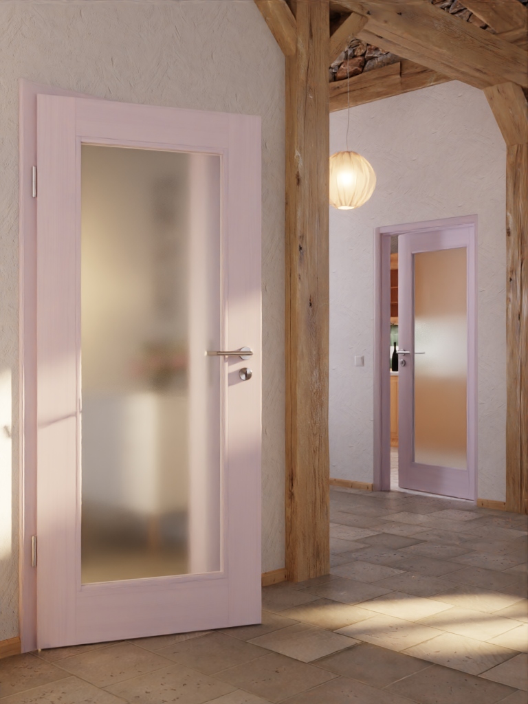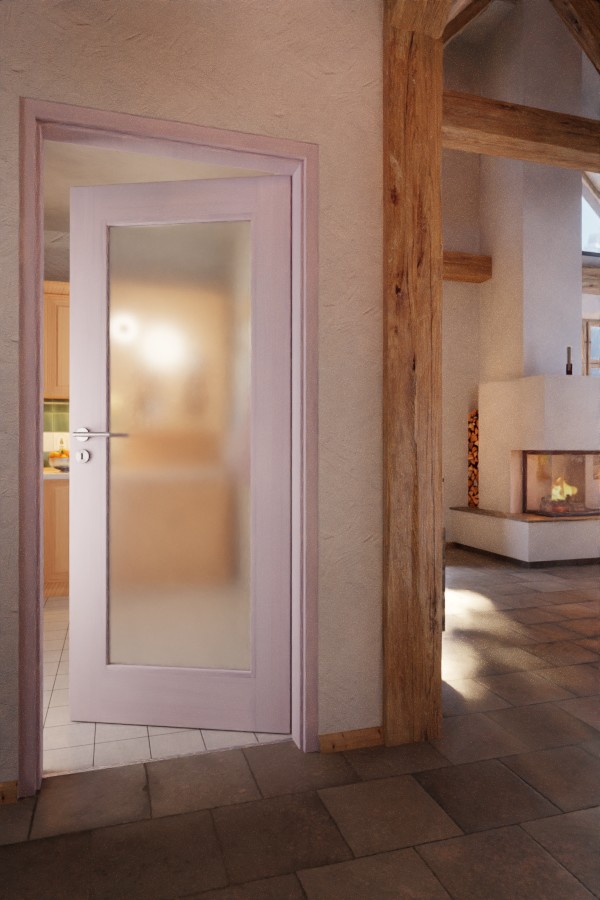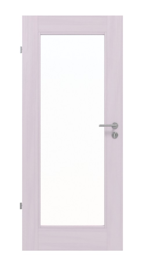 Wyraźne linie nadają nowoczesny wygląd modelowi. Duże przeszklenie w środku skrzydła drzwi otoczone jest prostymi listwami i szerokimi fryzami. Powierzchnia pokryta jest białym pigmentem, który delikatnie przepuszcza bezsękowy rysunek świerku.