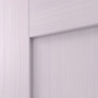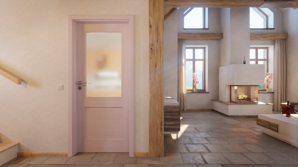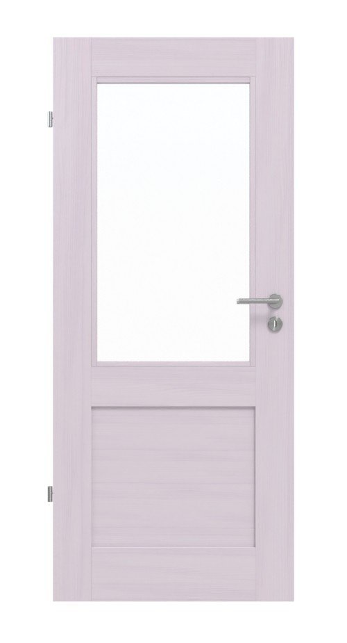 Dzięki prostemu wycięciu na światło i płaskiej, prostokątnej wypełnieniu z drewna naturalnego, drzwi wyrażają klarowny język formy. Delikatnie rysują się bezsękowe usłojenia sosny pod białym pigmentem, nadając każdemu skrzydłu drzwi unikalny, indywidualny charakter.