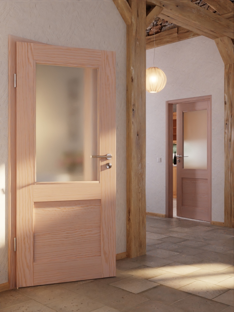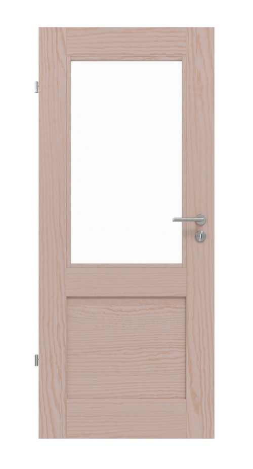 Model prezentuje się spokojnie z prostokątnym szkleniem i płaskim wypełnieniem z prawdziwego drewna. Bezsękowe usłojenie przechodzi przez drewno sosnowe, czyniąc każde skrzydło drzwi unikalnym dziełem.