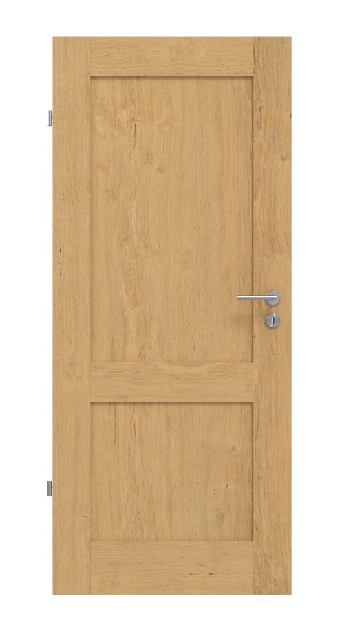 Dwie płaskie wypełnienia z prawdziwego drewna i proste listwy łączą się tutaj w nowoczesny design. Zawsze indywidualnie, naturalne usłojenie dębu jest widoczne na każdym skrzydle drzwi.