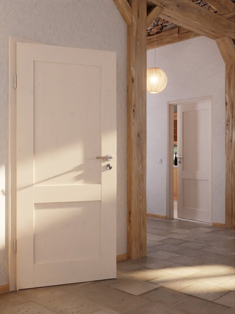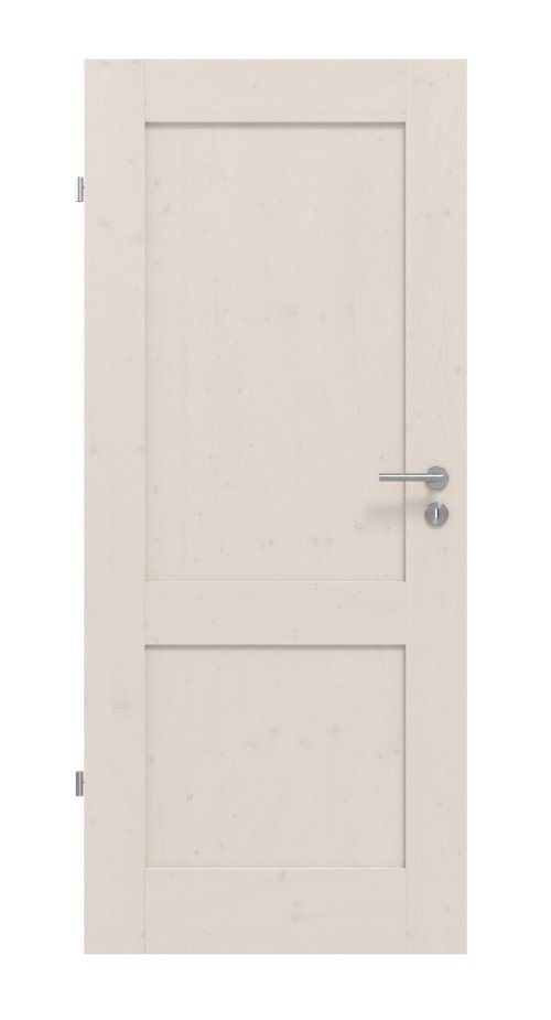Dwie płaskie wypełnienia charakteryzują nowoczesny charakter modelu. Dzięki białej pigmentacji drewno świerkowe zyskuje przyjazny wygląd. Pod nim delikatnie rysują się naturalne słoje drewna z wrostami, które czynią każde skrzydło drzwi unikalnym dziełem.