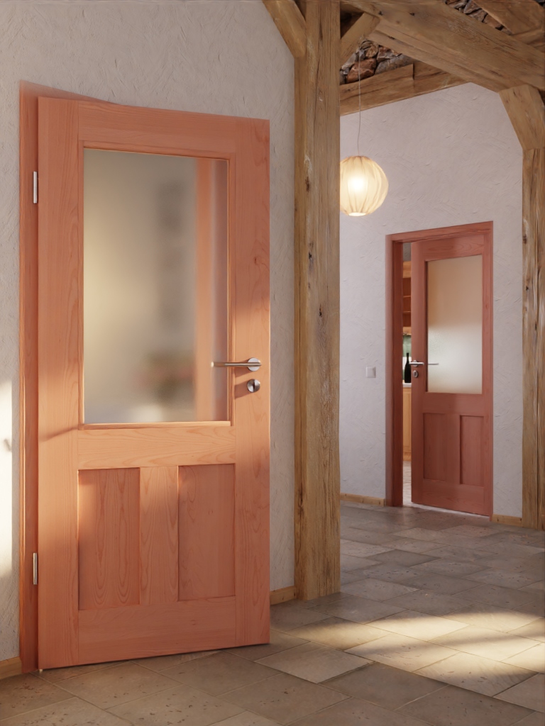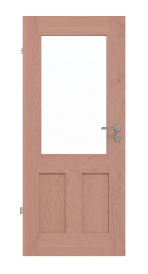 Model prezentuje się spokojnie z prostokątnym wypustem szklanym i dwoma mniejszymi, płaskimi wypełnieniami z prawdziwego drewna. Naturalna indywidualność drewna bukowego objawia się na każdych drzwiach w jednostkowym usłojeniu.