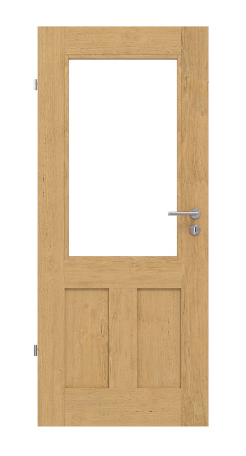 Wykusz świetlny, dwa mniejsze, płaskie wypełnienia i proste listwy szklane tworzą w tych drzwiach pokojowych nowoczesny design z wyraźnymi liniami. Zawsze indywidualnie, naturalne usłojenie dębu jest widoczne na każdym skrzydle drzwi.