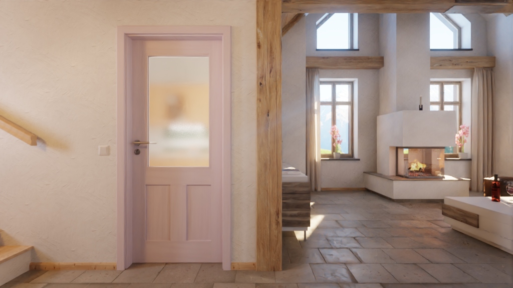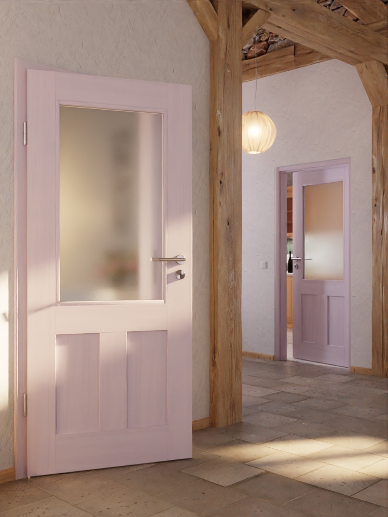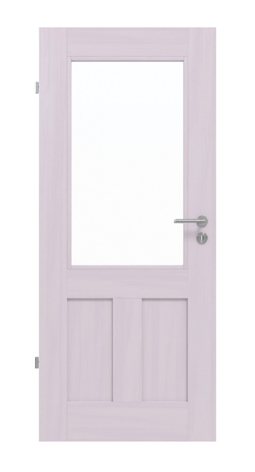 Dzięki swojemu prostemu wycięciu na światło i dwóm płaskim wypełnieniom z prawdziwego drewna, drzwi mają wyraźny język form. Biała pigmentacja nadaje bezsękowemu drewnu świerkowemu przyjazny wygląd. Pod spodem delikatnie rysują się naturalne słoje drewna, które czynią każdy panel drzwiowym unikalnym dziełem.