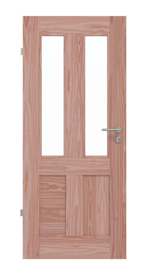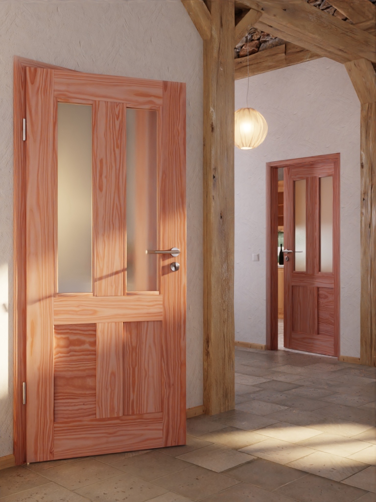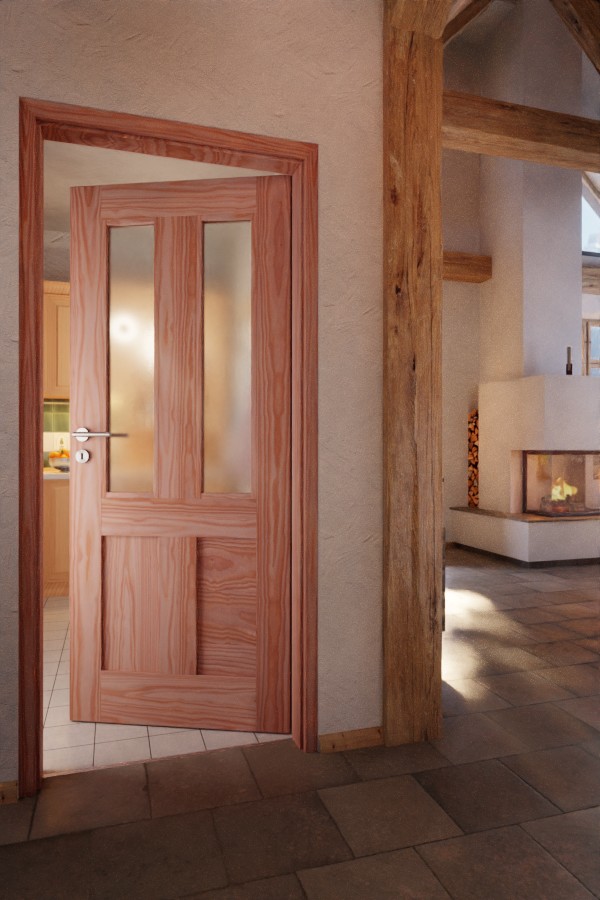 W skrzydle drzwi na górze znajdują się dwa smukłe przeszklenia, a na dole dwa wypełnienia z prawdziwego drewna o klarownej formie. Na drewno modrzewiowe rysują się naturalne słoje.