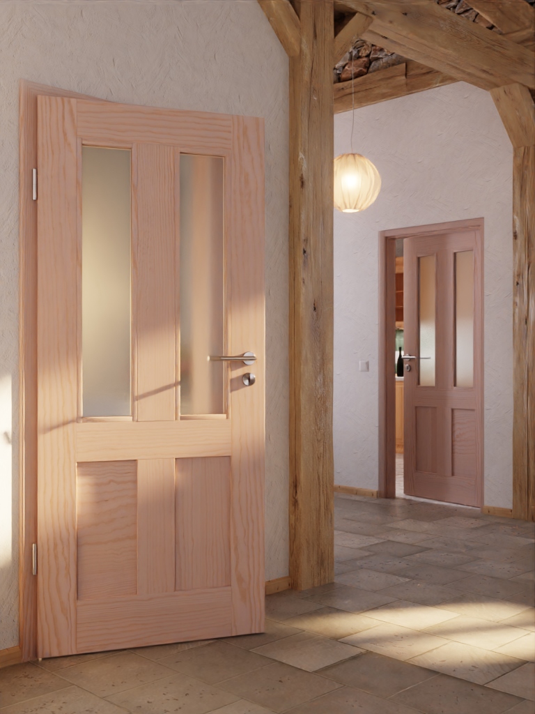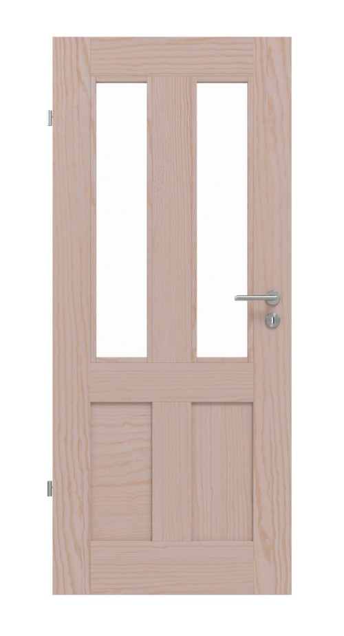 Dwa wąskie przeszklenia i dwa mniejsze, płaskie wypełnienia tworzą nowoczesny design tych drzwi wewnętrznych. Bezsękowe usłojenie przechodzi przez drewno sosnowe, czyniąc każde skrzydło drzwi unikalnym dziełem.