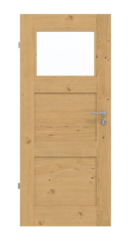 Wyraźne kontury dostarcza drzwi wewnętrzne z dwoma płaskimi wypełnieniami i prostokątnym otworem świetlnym. Żywe słoje z sękami kształtują rustykalny wygląd drewna dębowego.