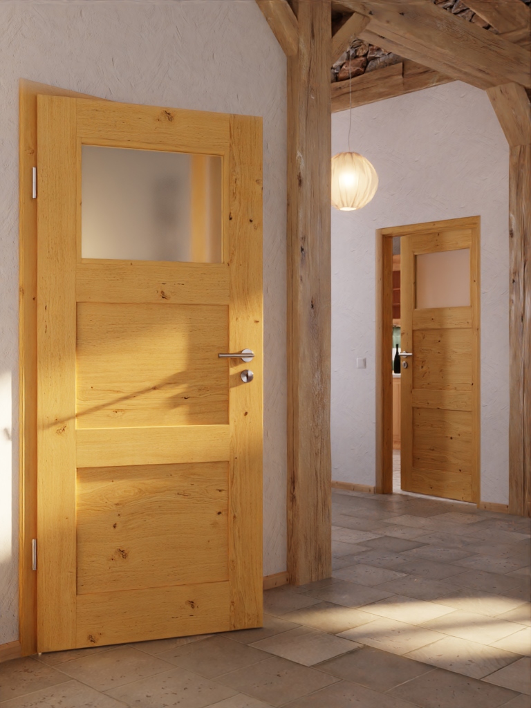 Drzwi z litego drewna klejone warstwowo okazują się niezwykle stabilne. Drewno pozostaje w standardzie nieobrobione, co daje największą swobodę twórczą przy wyborze ulubionego koloru. W menu konfiguracji dostępne są również różne wykończenia powierzchni, jeśli chcesz otrzymać drzwi z gotowym wykończeniem.