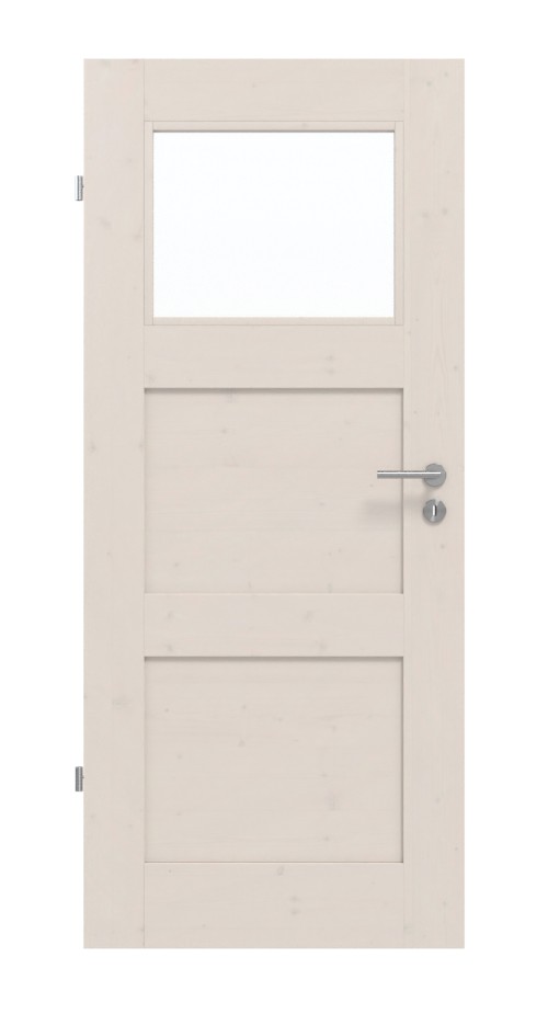 Współczesny design z wycięciem na światło i wypełnieniami z prawdziwego drewna wyróżnia się wyraźnymi liniami. Dzięki białemu pigmentowi drewno sosnowe zyskuje przyjazny wygląd. Pod nim delikatnie rysują się naturalne słoje drewna z wlotami gałęzi, które czynią każdą płytę drzwiową unikalnym dziełem.