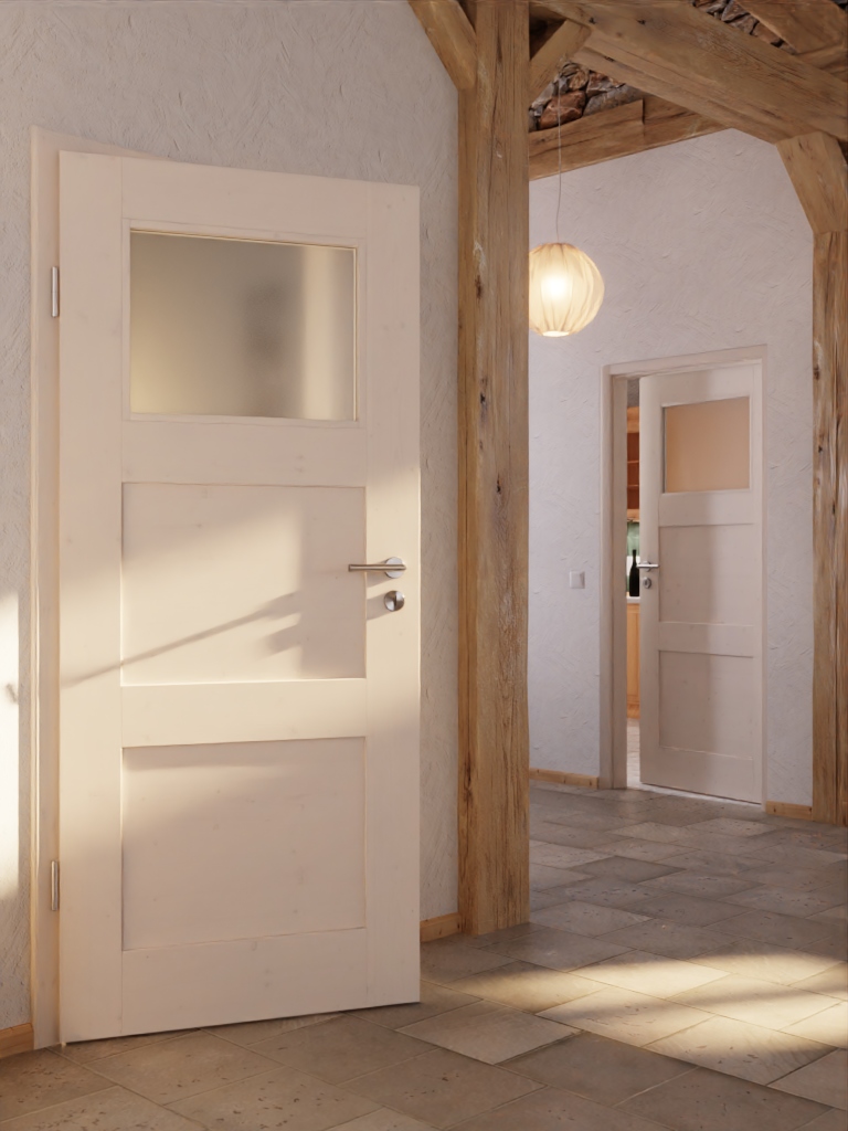 Drzwi z litego drewna klejone warstwowo charakteryzują się szczególnie wysoką stabilnością. Ostateczny szlif nadają im stylowo fazowane krawędzie.