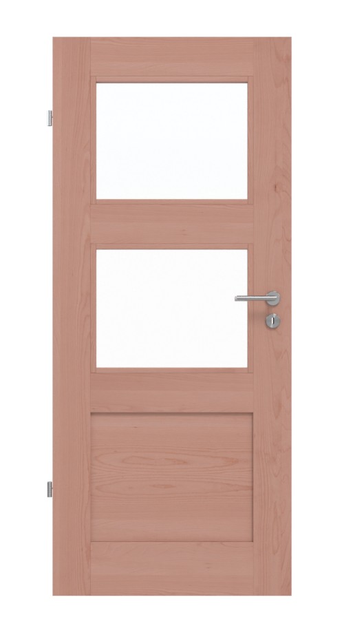 Wyraźne kontury dostarcza drzwi wewnętrzne z dwoma przeszkleniami i płaskim wypełnieniem z drewna naturalnego. Typowe usłojenie przebiega przez drewno bukowe w każdych drzwiach w całkowicie indywidualny sposób.