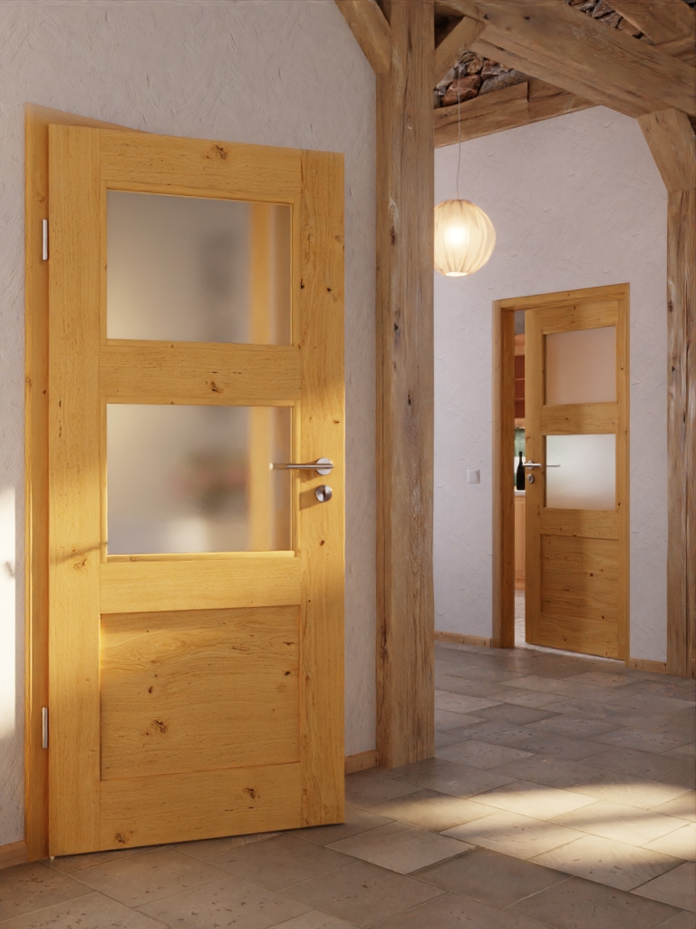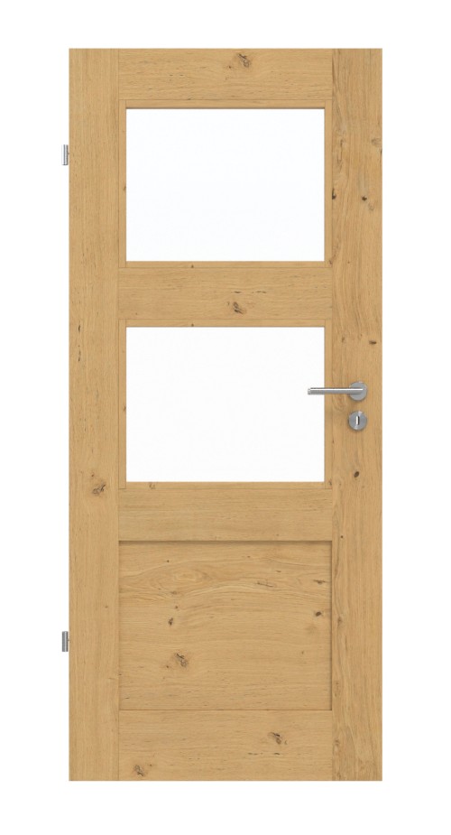 Nowoczesny design z dwoma przeszkleniami i wypełnieniem z prawdziwego drewna zachwyca swoją prostą linią. Sękowana struktura dębu jest wyjątkowo widoczna na każdym skrzydle drzwi.