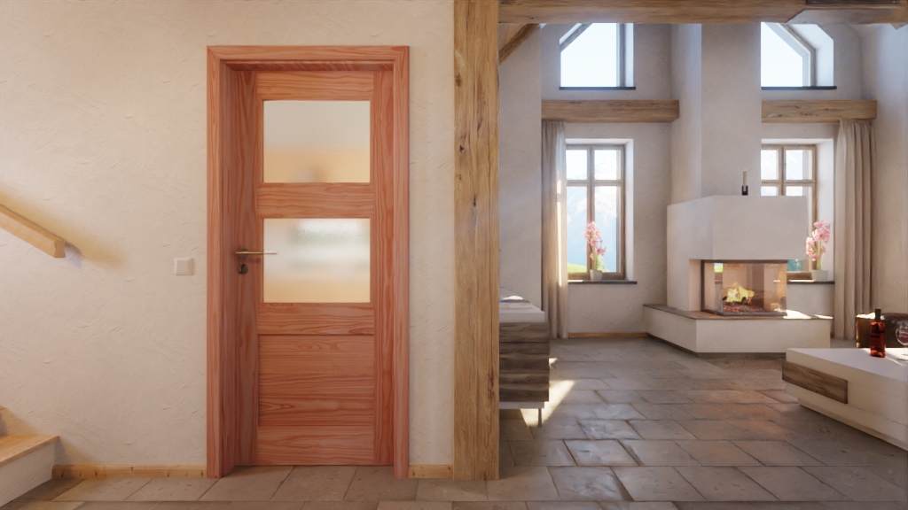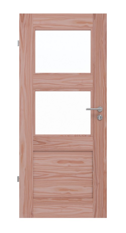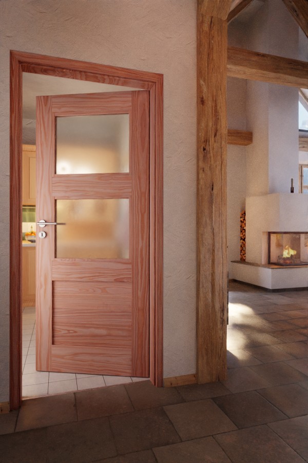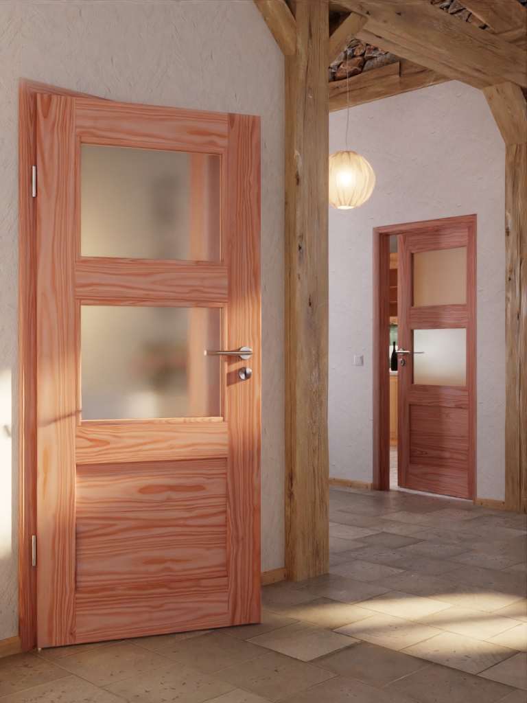 Nowoczesny design z dwoma przeszkleniami i wypełnieniem z prawdziwego drewna zachwyca swoją klarowną linią. Na drewno modrzewiowe rysują się naturalne słoje.