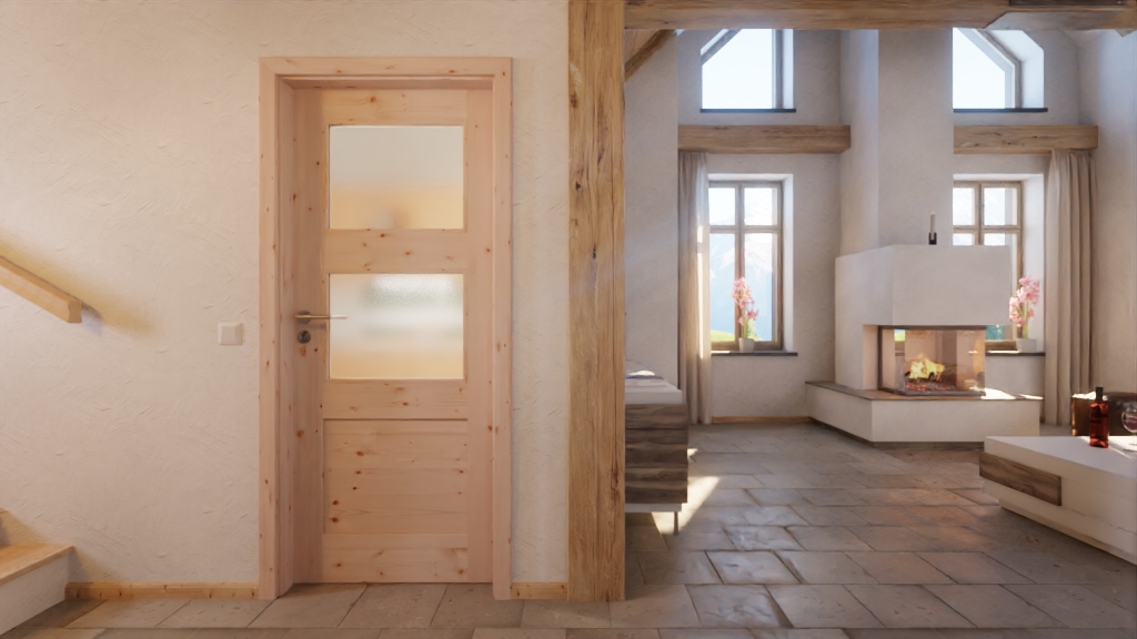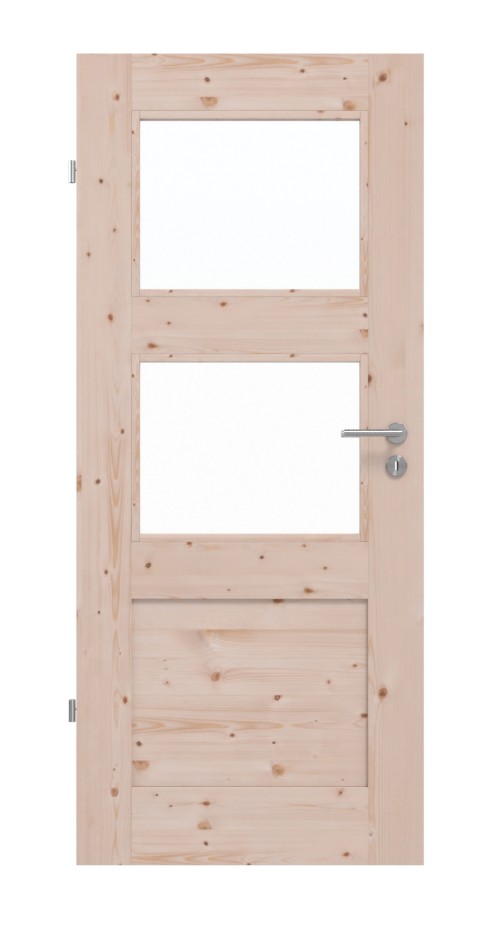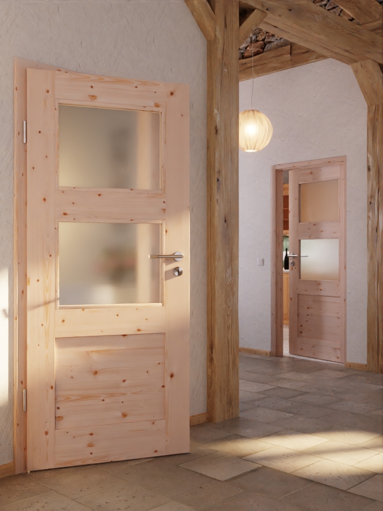 Nowoczesny design drzwi wewnętrznych składa się z dwóch przeszklenia i płaskiego wypełnienia. Rustykalny charakter drewna sosnowego żyje dzięki wyraźnym przejrzystościom sęków i typowym usłojeniom.